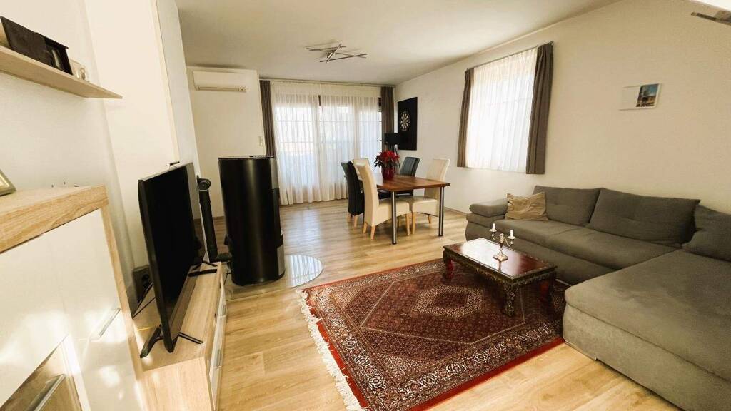 Herzstück der Wohnung ist ein großzügiger Wohnraum mit einem Pelletofen, der angenehme Wärme durch den Raum strömen lässt. Der Raum ist lichtdurchflutet und bietet ein modernes, kommunikatives Wohnen.