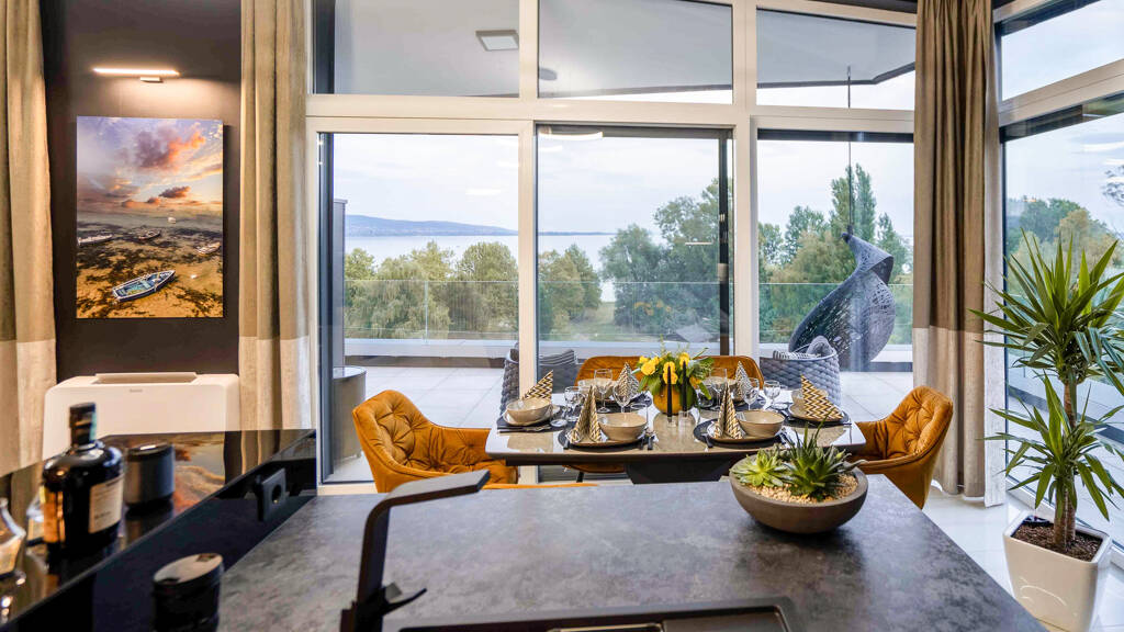 Beim Betreten der Immobilie finden Sie eine Lobby mit der Möglichkeit, nach links und rechts zu gehen. Rechts befindet sich die erste Tür, die zum Treppenhaus führt, das bis in die untere Etage reicht. Von hier aus betreten Sie den Hauptraum der Wohnung, das Wohnzimmer mit amerikanischer Küche, von wo aus Sie auf die Terrasse gelangen, das Schlafzimmer und das Bad mit Dusche. In der anderen Hälfte des Penthouses gibt es ein größeres Schlafzimmer und ein kleineres Zimmer/Büro, und an das Badezimmer mit Dusche + Badewanne wurde eine separate Toilette angebaut. Die Terrasse ist von 3 Seiten begehbar und umschließt fast das gesamte Grundstück. Sie bietet einen Panoramablick auf den Plattensee und den angrenzenden Wald. Auf der Terrasse gibt es einen Whirlpool, eine Sauna und natürlich einen bequemen Hängesessel und ein Gartensofa.