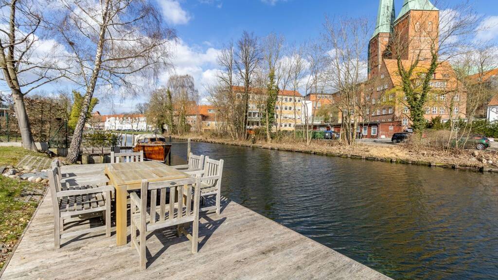 Im exklusiven Wohnprojekt „Kleiner Heimathafen“ – direkt an der Trave – präsentiert sich dieses außergewöhnliche Penthouse als echtes Premiumdomizil in absolut begehrter Lage von Lübeck. Die im Jahr 2020 errichtete Wohnung befindet sich im 2. Obergeschoss und ist bequem über einen Aufzug erreichbar. Auf ca. 128 m² Wohnfläche entfaltet sich ein modernes, großzügiges Raumkonzept mit klarer Architektur und hochwertiger Ausstattung. Herzstück des Penthouses ist der lichtdurchflutete Wohn- und Essbereich mit offener, stilvoll integrierter Einbauküche. Von hier aus gelangen Sie auf die beeindruckende, umlaufende Dachterrasse mit ca. 56 m² Fläche, die fließend in den Wohnraum übergeht und ein einzigartiges Wohngefühl schafft. Die Wohnung verfügt über insgesamt drei Zimmer, darunter zwei großzügige Schlafzimmer. Eines der Schlafzimmer wird durch eine separate Ankleide ergänzt. Beide Räume bieten direkten Zugang zur Terrasse und unterstreichen den besonderen Komfort. Das hochwertige Badezimmer ist mit Badewanne und Dusche ausgestattet, ein zusätzliches Gäste-WC ergänzt das Raumangebot. Besonders hervorzuheben ist der nahezu neuwertige Zustand der Wohnung: Seit dem Erstbezug im Jahr 2021 wurde sie ausschließlich als Büro genutzt und entsprechend äußerst pfleglich behandelt. Die hochwertige Ausstattung präsentiert sich somit in einem exzellenten, kaum genutzten Zustand und überzeugt durch eine geschmackvolle, zeitlose Gestaltung. Ein absolutes Highlight dieser Immobilie ist der eigene Bootsanleger direkt am Haus – eine Seltenheit und ein echtes Privileg in dieser Lage. Der liebevoll angelegte Gemeinschaftsgarten führt direkt ans Wasser und eröffnet dabei einen einmaligen Blick auf den Lübecker Dom sowie die Wakenitz – ein Ausblick, der diese Immobilie zu etwas ganz Besonderem macht. Auch das gesamte Gebäudeensemble überzeugt durch seine exklusive Architektur und eine hochwertige, durchdachte Gestaltung, die sich harmonisch in die besondere Wasserlage einfügt und den Anspruch dieses Wohnprojekts unterstreicht. Abgerundet wird dieses exklusive Angebot durch einen komfortablen Tiefgaragenstellplatz sowie einen separaten Kellerraum.