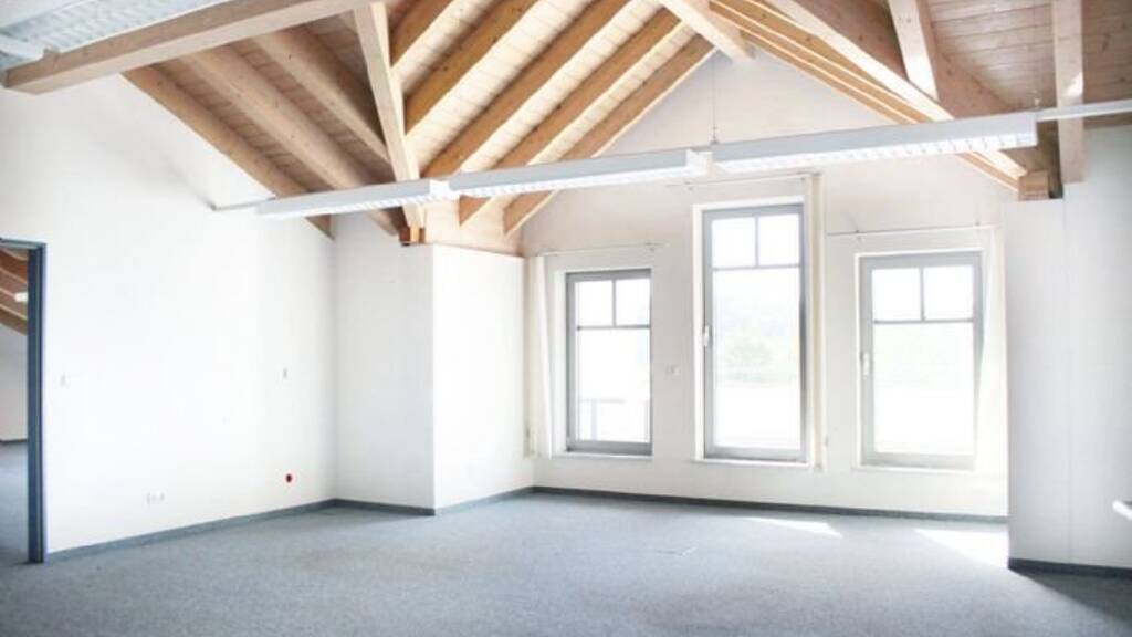 Sie betreten die Räume über einen allgemeinen Eingangsbereich / Empfangsbereich. Der große Büroraum mit offenen Sichtdachstuhl könnte auch auf Wunsch abgetrennt werden um mehrere Räume zu schaffen. Im hinteren Bereich sind Küchenanschlüsse vorhanden sowie ein Zugang zur sonnigen Dachterrasse. Es wurde ein blauer Teppichboden verlegt und Deckenleuchten sind bereits vorhanden.
