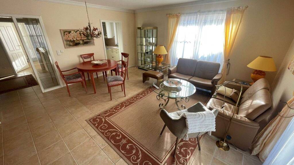Wohnkomfort: Großzügiger Wohn-Essbereich mit hochwertigen Fliesenböden und Fußbodenheizung.