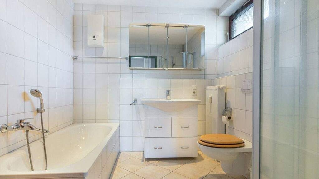 Das Tageslichtbadezimmer wurde 2007 komplett erneuert. Es gibt eine Badewanne, eine Dusche, ein Waschbecken und ein WC. Die Badmöbel können Sie kostenlos nutzen. Auch der Anschluss für Ihre Waschmaschine ist hier vorhanden. Einen Kondenstrockner können Sie auf die Waschmaschine stellen.