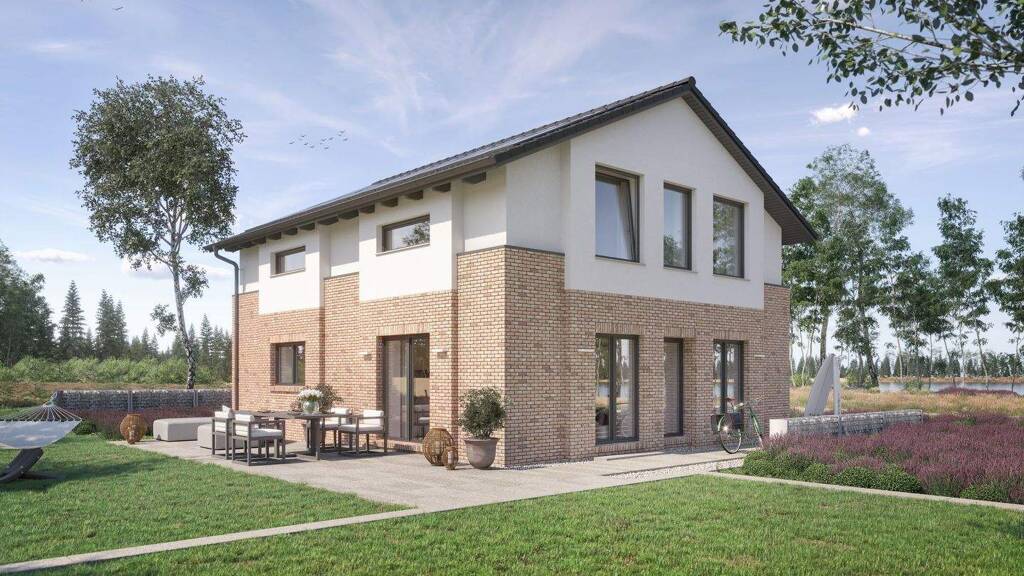 Wir projektieren dieses Hausmodell auf attraktiven Bau Flächen. Die gezeigte Lage dient als Beispiel für unsere aktuellen Bauplatz-Optionen.
