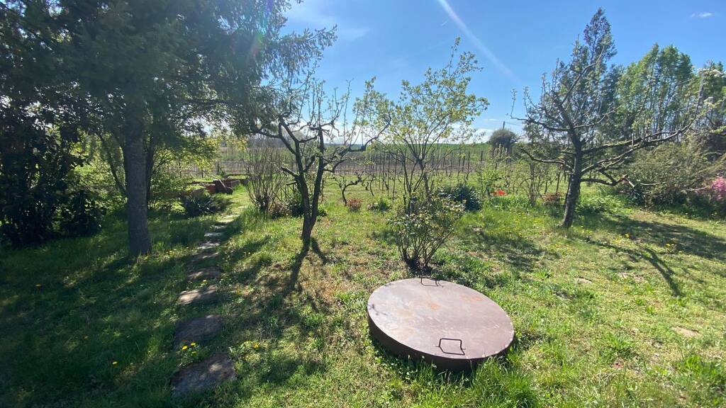 Im Garten: Kiefern, Obstbäume und 10 Reihen Weinreben in Kulturpflege