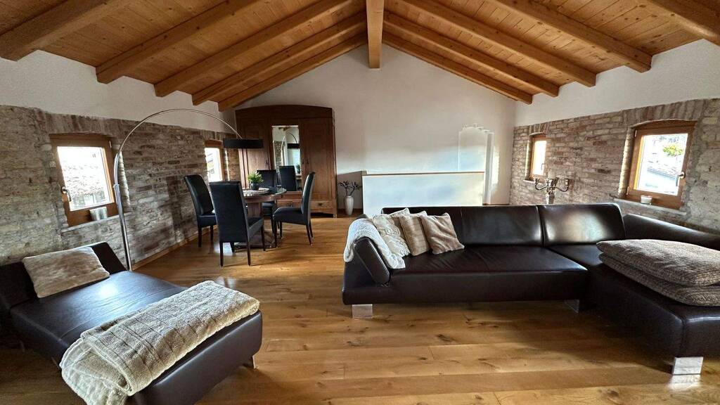 Hier befindet sich der Teil, in den sich viele Käufer „verlieben“: ein großzügiger Wohnbereich im Dachgeschoss, mit viel Liebe zum Detail gestaltet und mit sichtbaren Natursteinwänden und Holz-Kamin, die eine warme, authentische und sehr charaktervolle Atmosphäre schaffen.