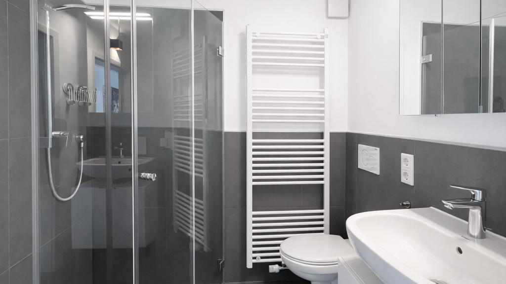 Das Badezimmer ist modern gestaltet und verfügt über eine ebenerdige Dusche.