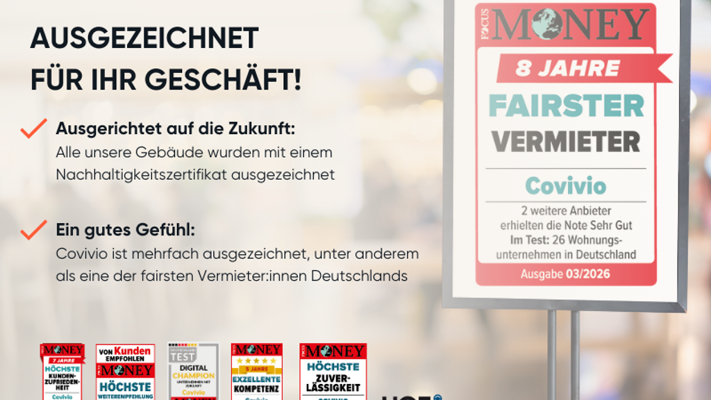 Covivio - eines der größten Immobilienunternehmen in Europa überwindet Grenzen, möchte überall den gleichen, bestmöglichen Service bieten und diesen auch in Zukunft auf die sich ändernden Bedürfnisse ihrer Kund:innen ausrichten. In Deutschland besitzt und bewirtschaftet Covivio über 41.000 Wohnimmobilien in den Städten Berlin, Leipzig, Dresden, Hamburg sowie in der Rhein-Ruhr-Region. Gut für Sie zu wissen! Covivio Mitarbeiter:innen werden von Ihnen bei Abschluss eines Mietvertrages niemals Gebühren verlangen. Wir bitten Kund:innen, Betrugsmaschen (insbesondere im Internet) oder jede Form von Compliance-Verstößen zu melden. Für Covivio ist Compliance Bestandteil der Unternehmenskultur. Nur so können wir als verlässlicher und vertrauenswürdiger Partner handeln und als ein solcher wahrgenommen werden. Weitere Informationen finden Sie hier: https://www.covivio.immo/compliance/