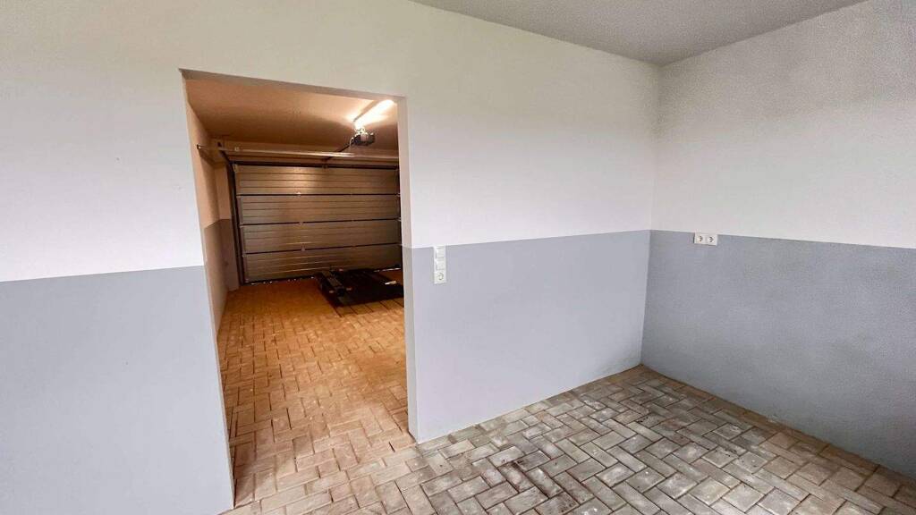 Zum Objekt gehört eine großräumige Garage mit angrenzendem Geräteraum und direktem Zugang zum Wohnbereich. Der Garagenboden wird mit Pflastersteinen versehen.
