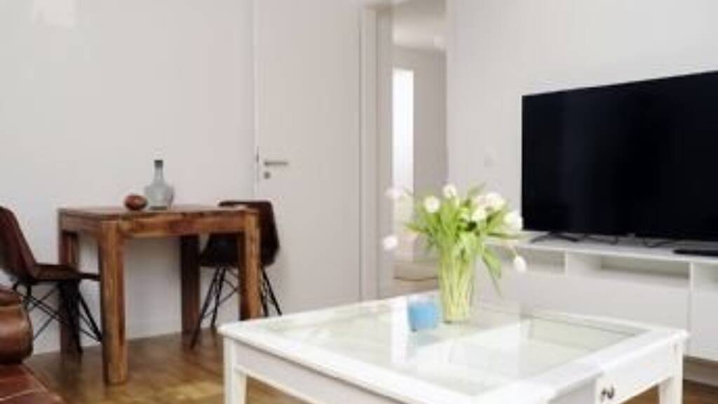 The beautifully cut two-room apartment, with large bedroom, large living room, open kitchen, bathroom with window and small bearings is a real jewel. The apartment has raised doorways (2.25 meters), open entrance-doors, a spacious bathroom with XXL-glass shower or bathtub. The Flat has new furniture (inkl. big flatcreen TV) with a great design (chosen from a known interior designer) and harmonious ensembles. Of course, the floor is equipped (in the kitchen) with Hardwood parquet. Your quality Mora-kitchen is equipped to the smallest detail - incl. Tableware and electrical equipment, oven, dishwasher. The offer is aimed at tenants who refuse to compromise. You get the business package: fully equipped - including high-quality furnishings, lamps, pictures etc.