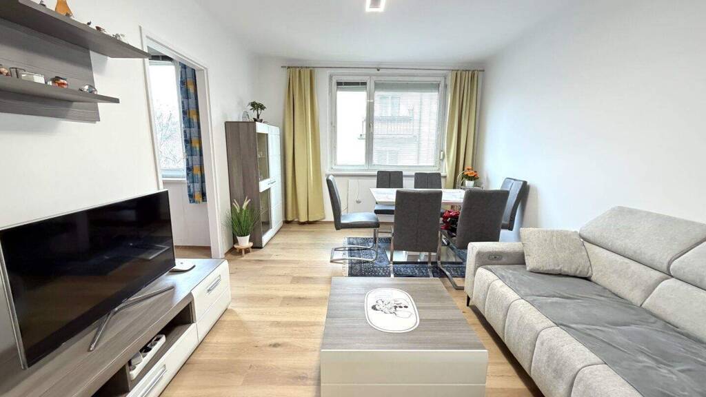 Die Raumaufteilung ist durchdacht und funktional: Ein großzügiger Wohnbereich mit angeschlossener Küche bildet das Herzstück der Wohnung. Zwei separate Schlafzimmer bieten ausreichend Platz für Familie, Homeoffice oder Gäste. Das Badezimmer ist mit einer Badewanne ausgestattet, das WC ist getrennt. Ergänzt wird das Raumangebot durch einen praktischen Abstellraum.