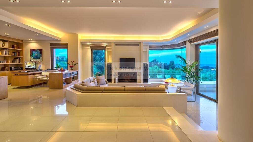 Eine Innentreppe führt in den ersten Stock, wo sich ein Hauptschlafzimmer mit einem Kingsize-Bett, einer Ankleidehalle und einem eigenen Badezimmer mit Whirlpool und Hydromassagedusche befindet. Das Hauptschlafzimmer hat Zugang zu einer großen Veranda mit Sitzecke und der besten Aussicht dieser Villa. Die kleine Insel Thodorou im Norden, der grüne Teppich, der die gesamte Umgebung bedeckt, und die Berge im Süden bilden ein wahrhaft großartiges Gemälde.