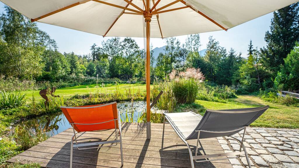 Für Naturliebhaber stellt die Lage und der Garten ein Highlight dar. Großzügige Terrassen mit angrenzendem Weiher laden ein zum Verweilen von Sonnenaufgang bis -untergang. Eine stilvolle Grill- und Außenküche bietet Gelegenheit für Feste der besonderen Art. An kalten Tagen sowie nach sportlichen Aktivitäten sorgt eine Außensauna mit Bergblick für den gewünschten Wohlfühlfaktor.