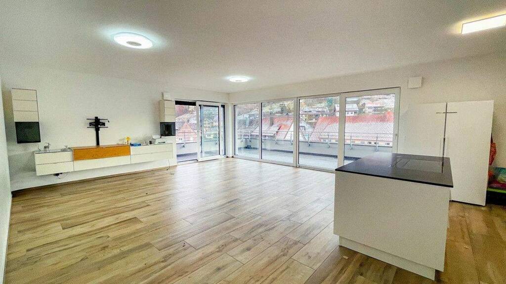 Am Ende des Flurs liegt ein zweites, großzügiges Schlafzimmer mit schönem Ausblick auf die Dachterrasse. Das Herzstück der Wohnung ist der ca.55 m² große Wohn- und Essbereich mit offener Küche. Eine breite Fensterfront bietet einen weiten Blick über die Dächer Calmbachs und sorgt für eine helle, einladende Atmosphäre.