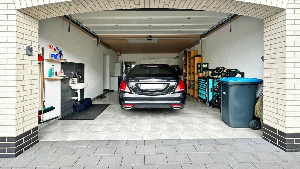 Sie befahren das Grundstück und parken Ihre Fahrzeuge bequem auf einem Ihrer zahlreichen Außenstellplätze oder in Ihrer großen Garage. Die Garage verfügt über einen direkten Zugang ins Haus und über einen eigenen Dachboden mit reichlich Stauraum. Sie bietet Platz für ein großes oder zwei kleinere Fahrzeuge hintereinander. Zusätzlich finden Sie in der Garage, neben Wasser- und Stromanschlüssen, eine kleine Küchenzeile.