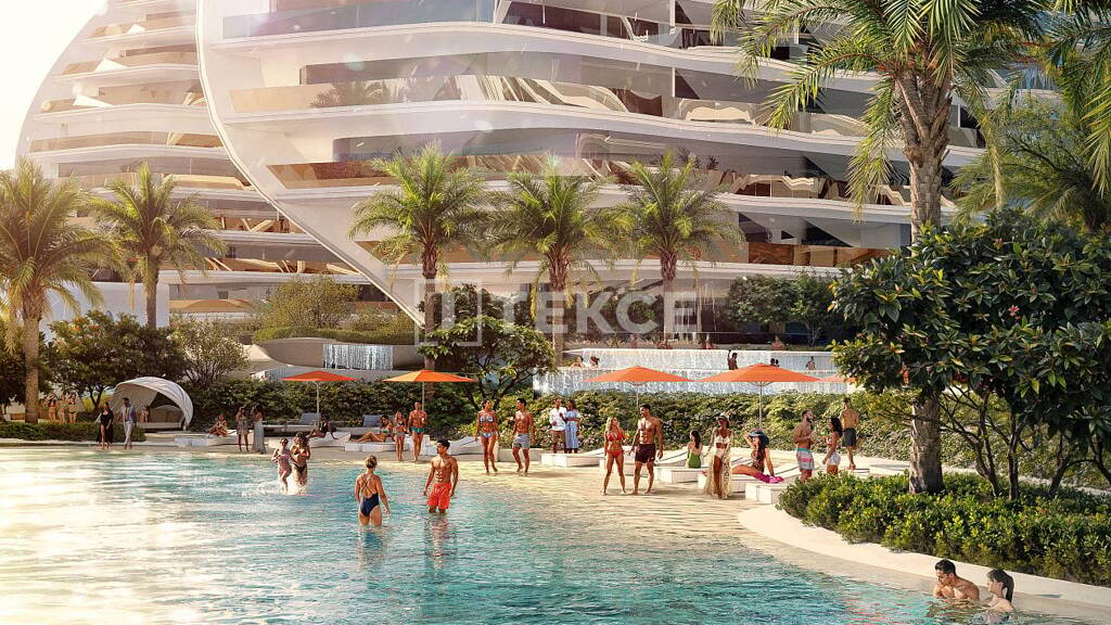 Das Projekt ist eine visionäre Entwicklung am Meer, inspiriert von der ikonischen Designphilosophie von Zaha Hadid, bei der fließende, skulpturale Formen die Bewegung des Meeres widerspiegeln und einen nahtlosen Dialog zwischen Architektur und Natur schaffen. Die fließenden Außenlinien und die geschwungene Fassade spiegeln organische Eleganz wider und bieten von jeder Wohnung aus einen Panoramablick auf den Arabischen Golf. Das Projekt wurde entwickelt, um das Leben an der Küste zu verbessern, und verfügt über eine umfangreiche Auswahl an Premium-Annehmlichkeiten: ein hochmodernes Fitnesscenter, private Trainingsstudios, Yoga-Pavillons, Paddle-Tennisplätze, einen Golfsimulator und Putting Greens. Für Freizeit und Entspannung genießen die Bewohner eine 100 Meter lange Kristalllagune mit einem künstlichen Strand, 360°-Endlos-Pools auf dem Dach, private Cabanas, beheizte Familien- und Sportbecken sowie landschaftlich gestaltete Sonnendecks. Zum Komfort im Innenbereich gehören ein privates Kino, ein Wellness-Spa mit Dampf- und Saunaräumen, Behandlungssuiten, Spielzimmer, eine Kunstgalerie und ruhige Lounges. Ein Dachrestaurant, ein handwerkliches Café, ein exklusiver Strandclub, ein haustierfreundlicher Park, Kinderspielplätze und ein 24-Stunden-Concierge-Service runden das Erlebnis ab.