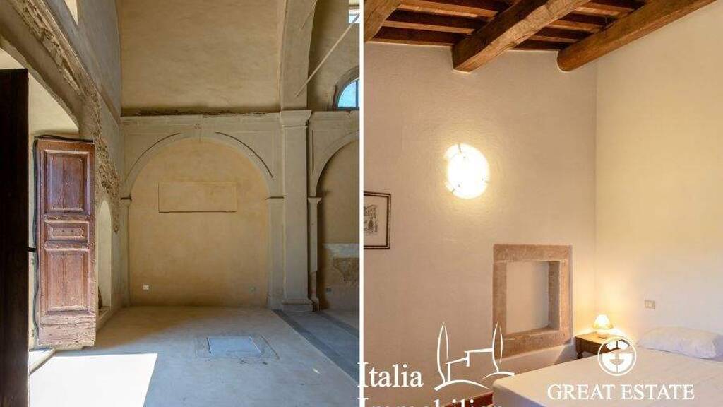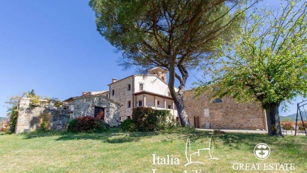 Das gesamte Anwesen hat eine Fläche von etwa 1000 Quadratmetern, im Jahr 2010 komplett renoviert wurde. Das einzigartige Bauernhaus erstreckt sich über drei Ebenen und ist intern wie folgt angeordnet: Im Erdgeschoss führt eine schöne alte Treppe in den ersten Stock, bestehend aus einer markanten Terrasse mit Steinsäulen, einem Flur, einer Küche mit Holzofen und schönen Terrakotta-Böden und Fliesen, einem Wohnzimmer, in dem der wunderschöne Kamin aus Travertin beeindruckt, einem Schlafzimmer, einem Badezimmer. Im zweiten Stock befinden sich vier Schlafzimmer und ein Badezimmer. Die ehemalige Trockenanlage für Tabak umfasst ein Wohnzimmer mit einem schönen Holzkamin, einen Essbereich, eine professionelle Küche, einen weiteren schönen Wohnbereich mit Fenstern und Fenstertüren, die auf den hinteren Teil des Gartens führen, ein Schlafzimmer, eine Küche, ein kleines Bad und ein Badezimmer, ein Wohnzimmer, einen Flur mit direktem Zugang zur entweihten und wunderschön restaurierten Kirche, die als Mehrzweckraum genutzt werden kann, ein 2016 komplett renoviertes Zimmer, eine ehemalige Sakristei, ein Blockheizkraftwerk, ein kleines Bad und ein Servicebad. Im ersten Stock mit Zugang von einer Außentreppe befinden sich ein Wohnzimmer, vier Schlafzimmer mit eigenem Bad und im zweiten Stock fünf Schlafzimmer mit eigenem Bad. Zusätzlich gibt es einen Anbau mit fünf Lagerräumen, ein Nebengebäude mit Wohnzimmer und Küche, zwei Schlafzimmer und ein Badezimmer. Die günstige Lage und die herrliche Aussicht bieten die Möglichkeit, einen schönen Swimmingpool zu bauen. Das Land besteht hauptsächlich aus etwa 5,5 ha Ackerland und etwa 1 ha Weideland.