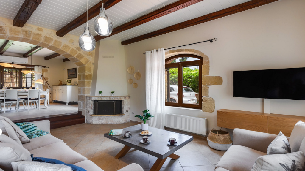 Im Erdgeschoss finden wir das Wohnzimmer mit Holzdecken und Steinelementen, die einige traditionelle kretische Merkmale bewahren. Die warme Atmosphäre wird durch den Kamin verstärkt. 2 kleine Stufen führen uns zum Esszimmer und links sind die voll ausgestattete Küche und ein WC. Es gibt auch ein Schlafzimmer mit einem Doppelbett und ein eigenes Badezimmer mit Badewanne.