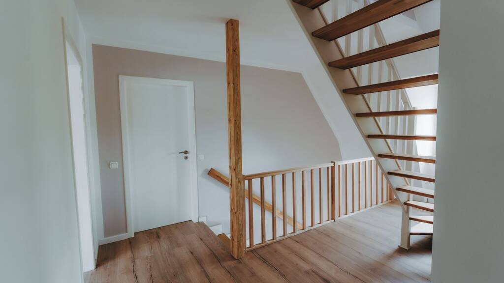 Die offene Holztreppe, die das Obergeschoss mit dem Dachgeschoss verbindet, fügt sich harmonisch ins Gesamtbild ein und unterstreicht den hochwertigen und wohnlichen Charakter dieses Hauses.