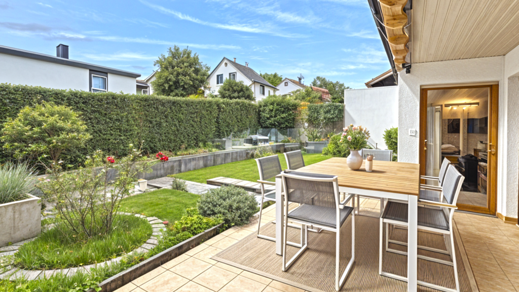 Der offizielle Eingangsbereich befindet sich aktuell im Gartengeschoss und öffnet sich zu hellen Zimmern mit Tageslicht, Heizung und eigenem Bad. Diese Räume eignen sich hervorragend als Einliegerwohnung, Büro, Atelier oder Gästebereich. Im hinteren Bereich befinden sich Technik- und Abstellräume, Sauna und Werkstatt. Von hier gelangt man auf die überdachte Gartenterrasse, an heißen Tagen ein angenehm kühles Plätzchen. Die Eigentümer haben das Grundstück terrassiert und im Nutzgarten ihr eigenes Obst und Gemüse angebaut.