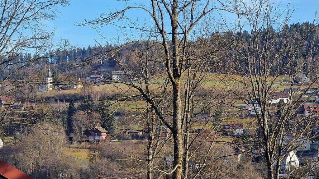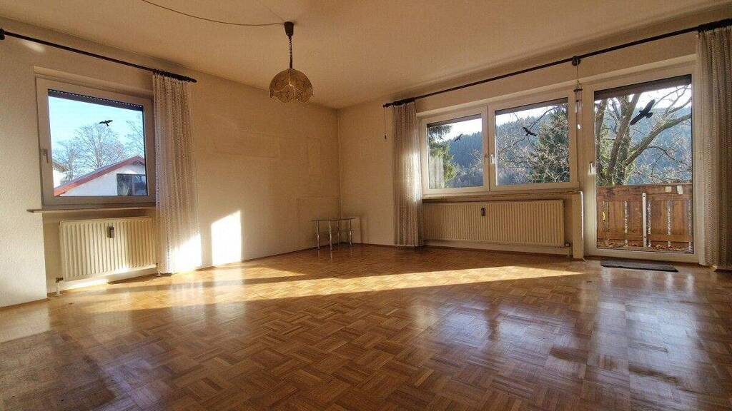 Von hier blickt man rundum in die Natur und kann die Ruhe dieser etwas erhöhten Hanglage genießen. Am besten gelingt das vom überdachten Balkon mit seiner schönen Aussicht. Dieser geschützte Balkon erstreckt sich in ganzer Breite vor dem großzügigen Wohn- und Essbereich, der wiederum den Mittelpunkt des Hauses bildet. Zum Essen sitzt man gegenüber dem gemütlichen Kachelofen und direkt nebenan liegt eine relativ große Küche mit Esstresen. Hier kann man ruhig und entspannt das Leben genießen.