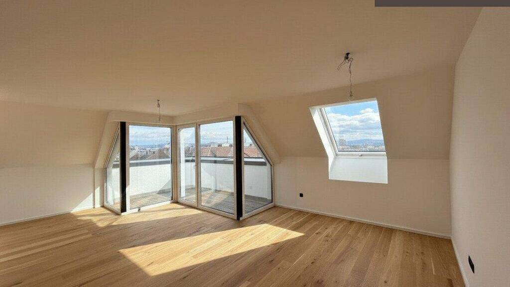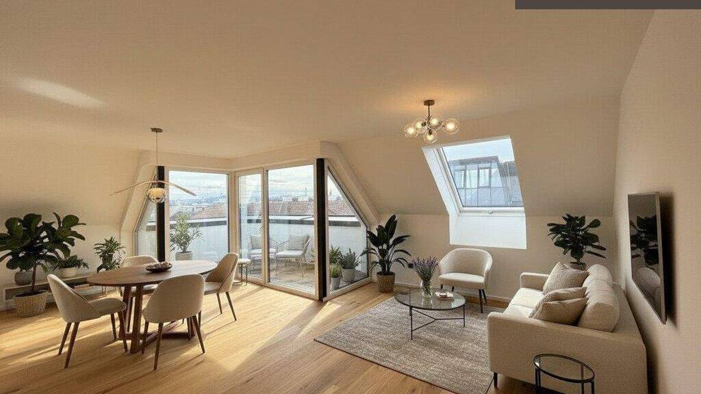 Der offen gestaltete Wohn- und Essbereich präsentiert sich hell, großzügig und einladend. Von hier aus ist die erste Terrasse direkt begehbar, die den Wohnraum harmonisch nach außen erweitert und einen beeindruckenden Ausblick in Richtung Gloriette bietet - ein besonderes Highlight, das dem Wohnen im Dachgeschoss eine außergewöhnliche Atmosphäre verleiht.