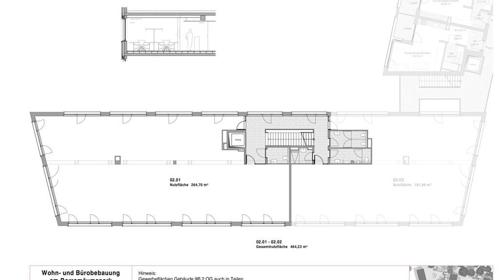 Die mietgegenständliche Büro - / Gewerbeeinheit verfügt über 264,70 Quadratmeter und hat zwei Eingänge. Es könnte auch die gesamte Stockwerksfläche mit rund 465 Quadratmetern angemietet werden.