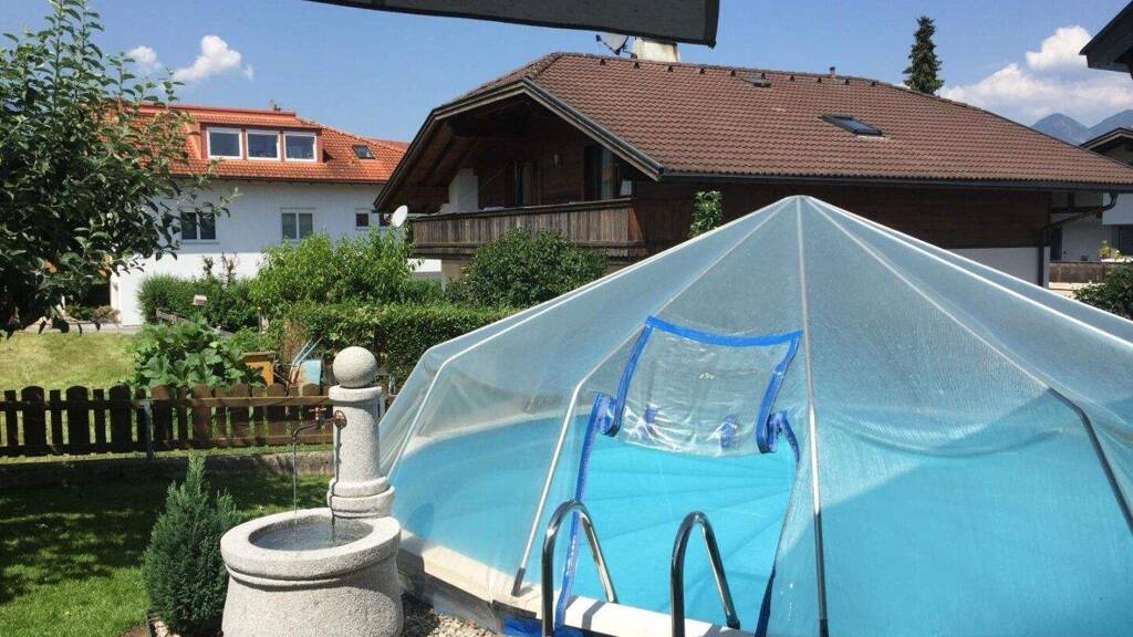 Ein besonderes Highlight ist der großzügige Gartenbereich mit Terrasse und Pool. Die Erdgeschosswohnung verfügt über eine beheizte Terrasse mit Pelletsofen sowie direkten Zugang in den Garten. Das Schwimmbad (rund, ca. 5,6 m Durchmesser) bietet zusätzliche Freizeitqualität. Die Pooltechnik ermöglicht eine Entleerung über Tauchpumpe in den Kanal, eine Wärmepumpe ist anschließbar. Ergänzt wird der Außenbereich durch eine Gartenhütte; eine vorhandene Solardusche ist aktuell defekt.