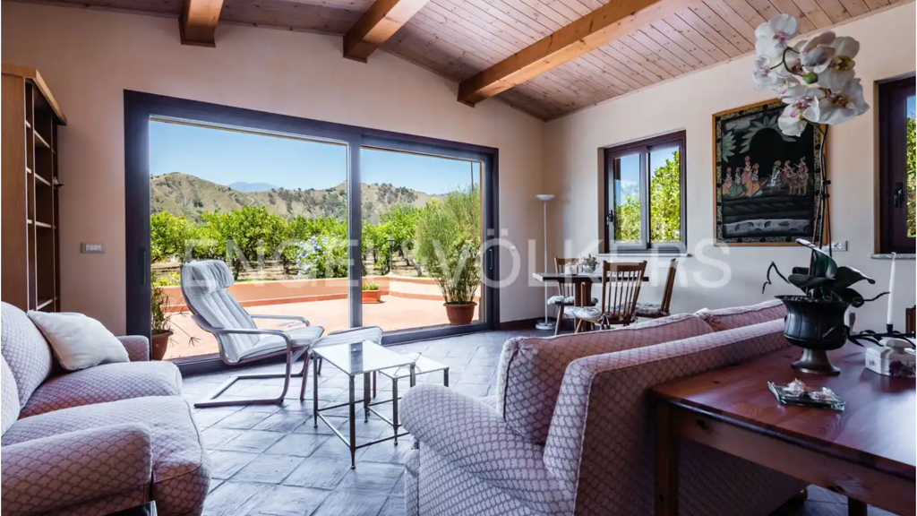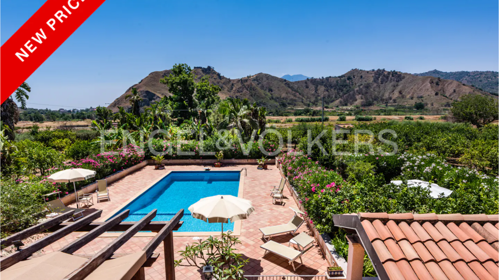 Eine komfortable Villa in einer Oase des Friedens und der Ruhe in der Landschaft von Taormina, in einer außergewöhnlichen natürlichen Umgebung, nur wenige Schritte von den Ufern des Flusses Alcantara entfernt. Das Anwesen ist von ca. drei Hektar Land umgeben, das hauptsächlich mit Zitrusfrüchten und Olivenbäumen bepflanzt ist. Der Garten um den Swimmingpool ist mit seltenen mediterranen Pflanzen geschmückt.