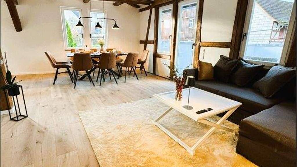 Die Wohnung befindet sich im 1. Obergeschoss eines historischen Fachwerkhauses. Es handelt sich um den Erstbezug. Das Haus wurde kernsaniert und auf den neuesten Stand der Technik gebracht. Die historische Substanz trifft auf moderne Ausstattung, unter anderem Fußbodenheizung. Die Wohnung verfügt über zwei getrennte Schlafzimmer, ein Arbeitszimmer (hier könnte auch ein Bett dazugestellt werden), ein Wohnzimmer und ein Esszimmer sowie eine offene, moderne Küche. In der Wohnung befinden sich ein Bad mit Dusche sowie ein Gäste-WC. Außerdem gibt es einen Extraraum für Garderobe und eine Speisekammer.