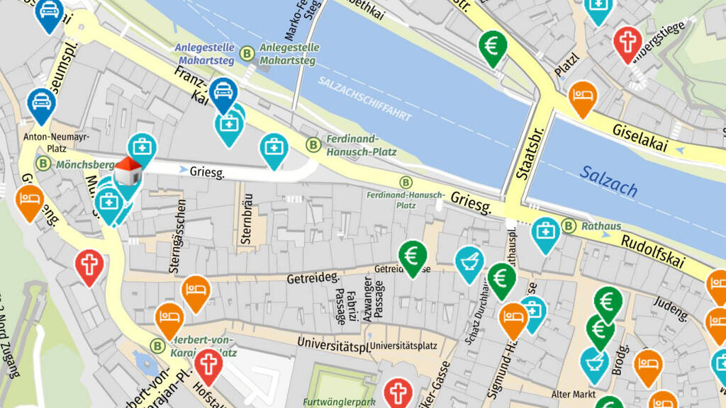 Gebührenpflichtige Parkmöglichkeiten sind fußläufig in der Altstadt-/Mönchsberggarage (Ausgang Mönchsbergaufzug) als auch am Rot-Kreuz-Parkplatz am linken Salzachufer vorhanden.