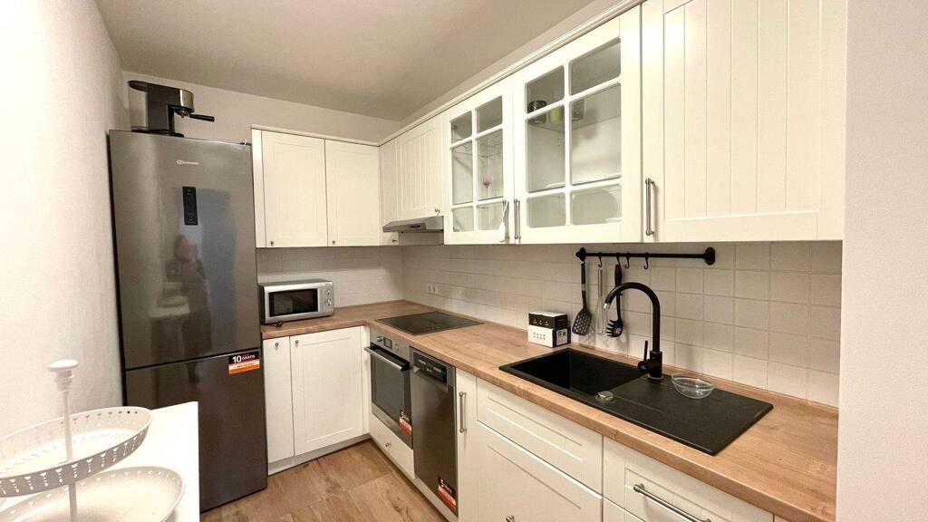 The apartment offers a quiet courtyard location on the 1st floor, an elevator, and a spacious balcony. It is fully furnished and features a modern fitted kitchen in country-house style (2019) with branded Bauknecht appliances. The bathroom was modernized in 2019, and high-quality vinyl flooring in wood-look was installed during the renovation. A washing machine is included. An optional underground parking space can be purchased for €15,000 with low-barrier access via the elevator. A basement storage unit and a pleasant homeowners' association complete the offering. The apartment has excellent public transport connections.