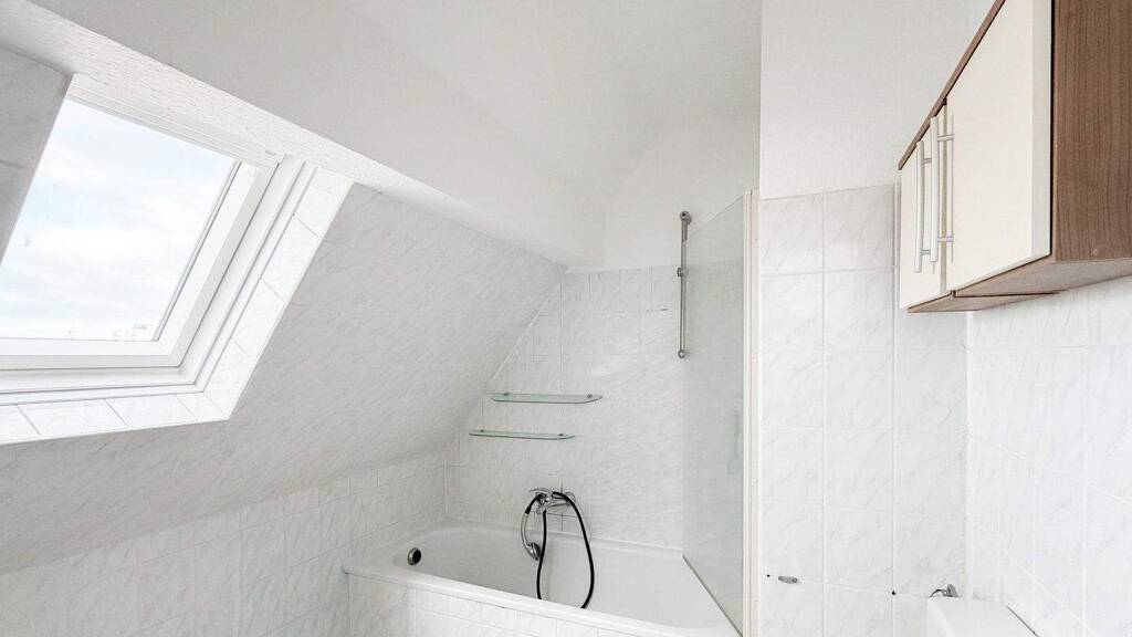 Das Tageslichtbadezimmer mit Badewanne schafft einen angenehmen Ort zum Abschalten. Ein eigener Außenstellplatz direkt vor der Tür ergänzt die praktische Seite des Angebots.