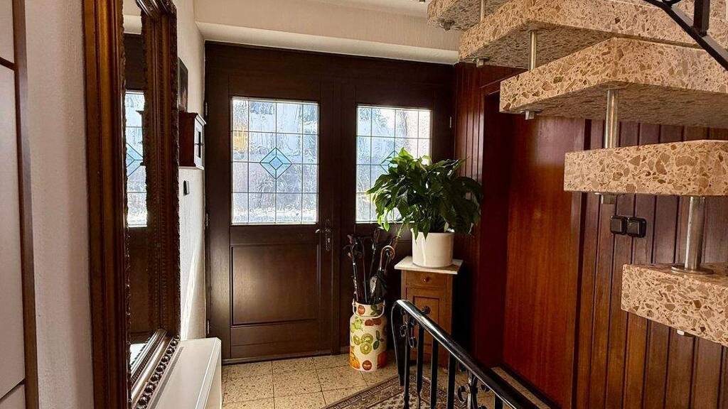 Bereits beim Betreten des Hauses empfängt Sie ein einladender Eingangsbereich mit einer stilvollen Treppenanlage aus Naturstein und dekorativem Geländer. Das Erdgeschoss bietet mehrere großzügige Wohnbereiche mit großen Fensterflächen, die für viel Tageslicht sorgen. Das Wohnzimmer lädt zum Entspannen ein, während der angrenzende Essbereich ausreichend Platz für gemeinsame Mahlzeiten mit bietet. Die funktional geschnittene Küche bietet genügend Arbeitsraum für den täglichen Gebrauch. Ergänzt wird diese Etage durch ein Tageslichtbad mit Badewanne, Dusche, Waschbecken und WC.