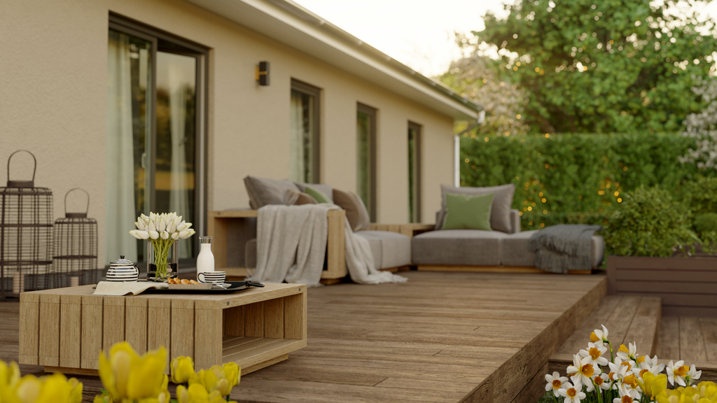 Bungalow 131 Familienleben auf einer Ebene - Der Bungalow 131 hat es in sich – 5 Zimmer, zwei Kinderzimmer und zwei Bäder – viel Wohnfläche und clever nutzbarer Stauraum für die ganze Familie. Die kluge Raumaufteilung bietet eine große Wohnküche in der Sie mit ihren Lieben Freizeit und Essen genießen können. Das traumhafte Wohnzimmer mit seinen großen Fenstern ist der perfekte Ort zum Entspannen, bietet freien Blick in Ihren Garten und mit wenigen Schritten sind Sie auf Ihrer Terrasse im Grünen.