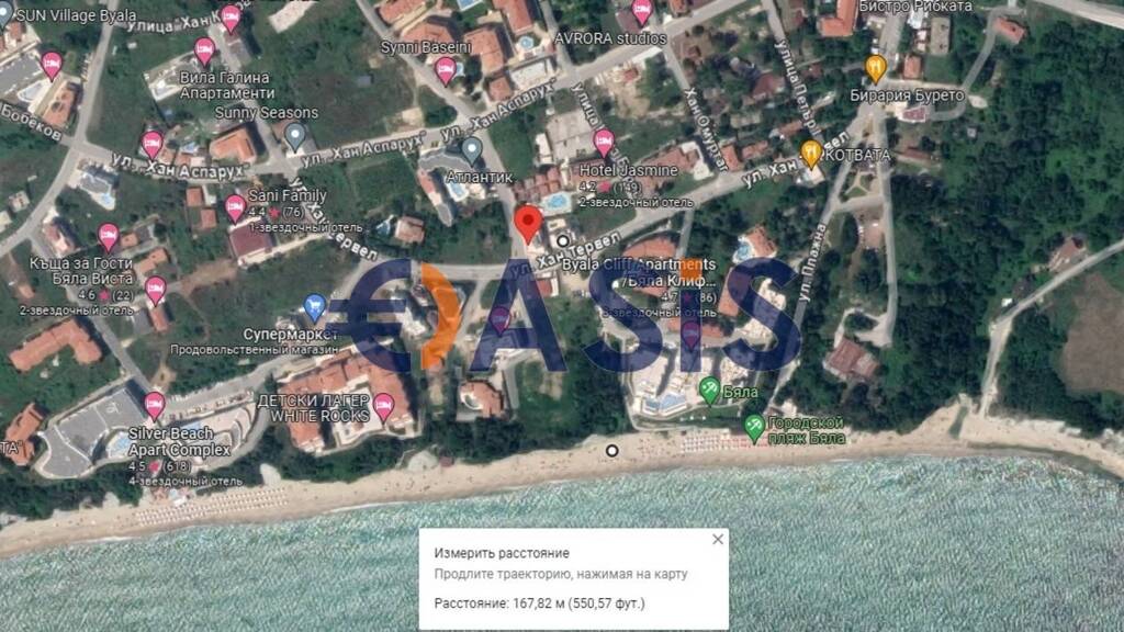 Byala ist eine kleine, ruhige und blühende Küstenstadt. Es liegt im östlichen Teil Bulgariens, fast an der Grenze der Regionen Varna und Burgas. Die nächstgelegene Stadt ist der 6 Kilometer entfernte Ferienort Obzor. Die Entfernung nach Varna beträgt 60 Kilometer nördlich und nach Burgas 80 Kilometer südlich. Die Stadt ist bekannt für ihre Strände mit weichem Sand, angrenzend an grüne Laubwälder, sauberes Meerwasser und gesunde Bergluft.