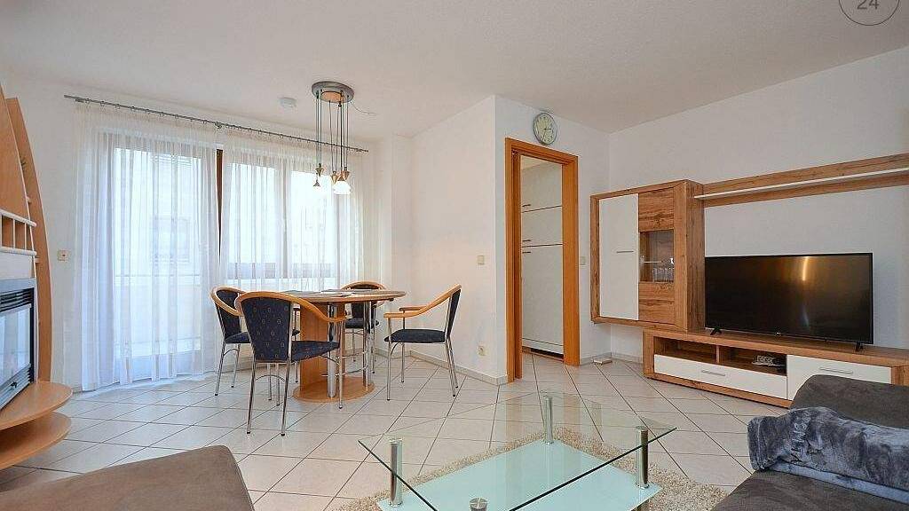 Das großzügige Wohn- und Esszimmer ist mit einem großen Sofa, einem Esstisch mit vier Stühlen und einer Schrankwand mit Flat-TV eingerichtet.
