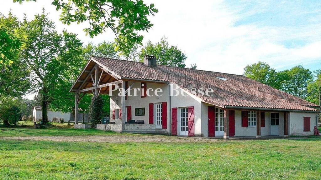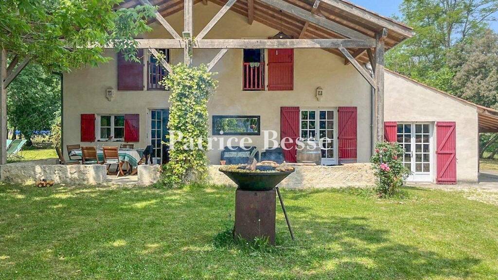 Built at the back of the property, the dwelling features architecture inspired by other homes in the Basque-Landes area, a style that is recognisable here thanks to its wide porch roof in front of its main façade to the east. The latter, bordered by a large patio, the space of which is defined by a low wall, represents a pleasant and covered outdoor area, while a second porch roof, smaller in size, covers a walkway in front of the dwelling's northern exterior.