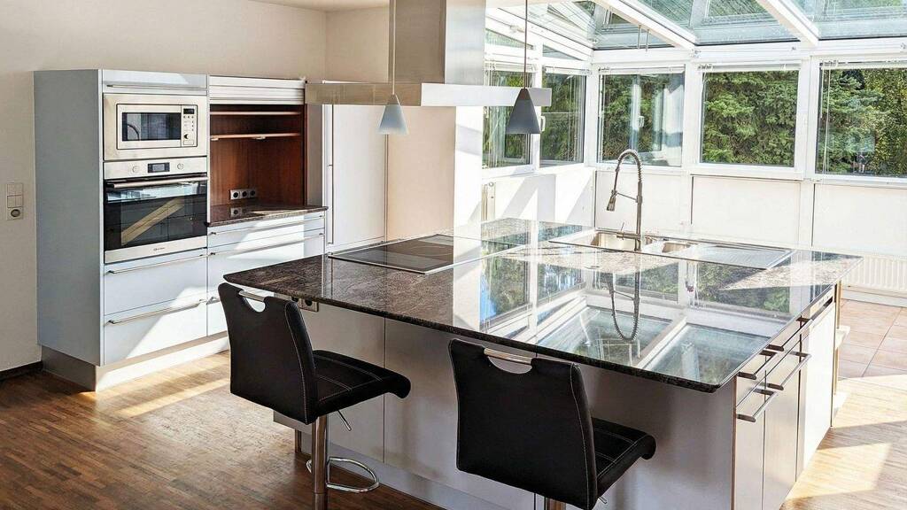Beim Betreten der Wohnung werden Sie von einer großzügigen Diele in Empfang genommen, welche als zentraler Verteiler zu allen Räumlichkeiten und Etagen fungiert. Rechterhand finden Sie die offene Küche, welche durch einen verglasten Wintergarten komplettiert wird, der Zugang zur großzügigen Dachterrasse bietet.