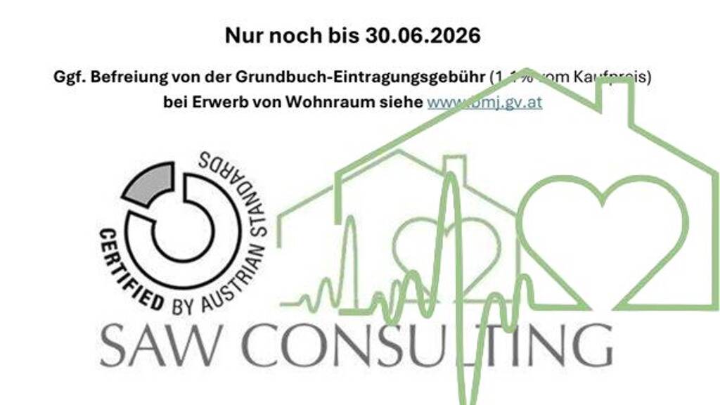 Nur noch bis 30.06.2026 - ggf. Befreiung von der Grundbuch-Eintragungsgebühr (1,1% vom Kaufpreis) bei Erwerb von Wohnraum siehe www.bmj.gv.at