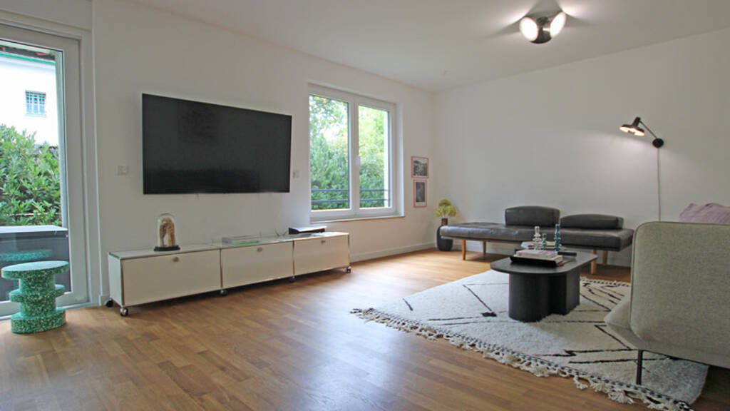 Diese attraktive Eigentumswohnung im Erdgeschoss bietet auf rund 94 m² Wohnfläche modernen Komfort und ein stilvolles Wohnambiente. Die drei gut geschnittenen Zimmer eignen sich ideal als Schlafzimmer, Wohn-/Essbereich und Arbeits- oder Kinderzimmer. Große Fenster sorgen für helle, lichtdurchflutete Räume und bieten teilweise einen schönen Blick in den Garten.