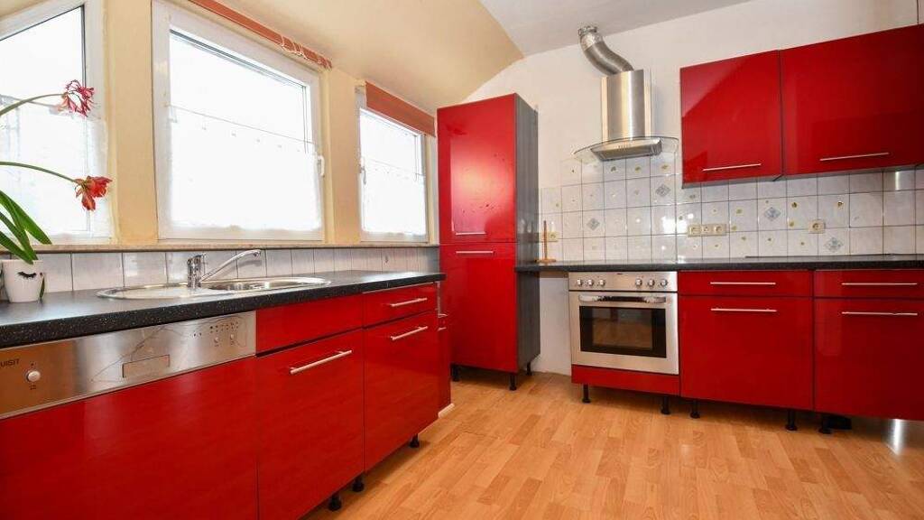 Oben angekommen finden Sie den Wohn- und Kochbereich mit einer Einbauküche vor. Von hier aus gelangen Sie auf die Loggia - ein geschützter Rückzugsort, auf dem sich im Sommer der Morgenkaffee in ruhiger Atmosphäre genießen lässt.