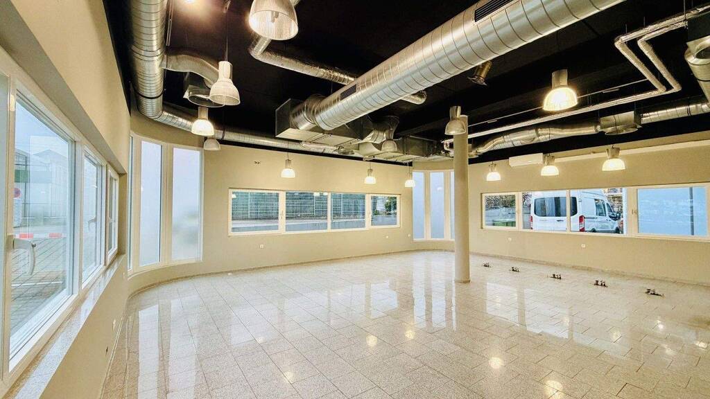 Der großzügige Verkaufsraum ist hervorragend geschnitten und dank der umlaufenden, großflächigen Fensterfronten vollständig lichtdurchflutet. Die hohen Decken sorgen für ein außergewöhnlich angenehmes und loftartiges Raumgefühl, während der edle Granitboden dem Objekt eine hochwertige und zeitlose Optik verleiht. Für zusätzlichen Komfort ist der Verkaufsraum klimatisiert.
