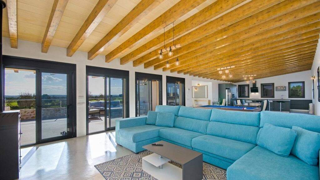 Über die große Fensterfront hat man einen fantastischen Ausblick in die Natur und bis hin zu Sant Salvador bei Felanitx. Durch diese Glas-Schiebe-Elemente gelangt man auch auf die Sonnenterrasse und zum Außenpool mit integriertem Whirlpool.