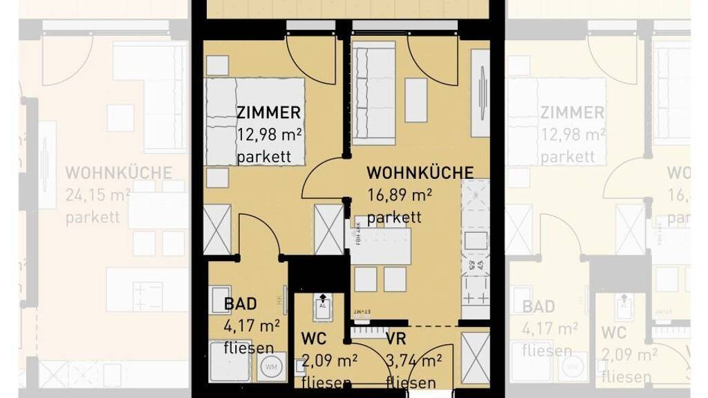 Sollten Sie mehr Platz benötigen, planen wir auch gerne eine größere Wohnung (zB eine 4-Zimmer-Wohnung anstelle von zwei nebeneinander liegenden 2-Zimmer-Wohnungen) für Sie. Fragen Sie einfach bei unserem Vertrieb nach!