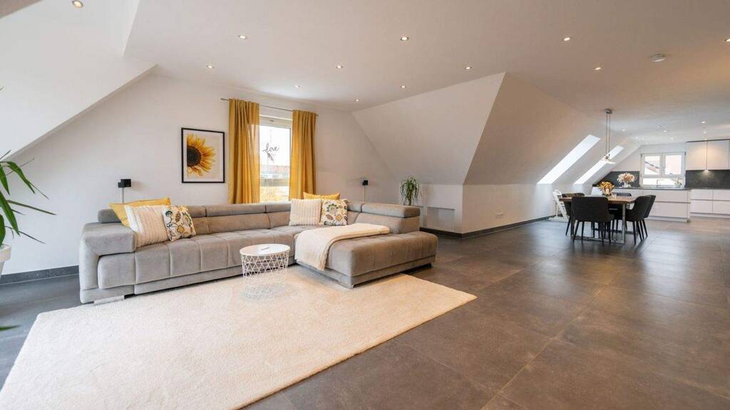 Diese exklusive Dachgeschosswohnung in Hallstadt bei Bamberg überzeugt durch ihre außergewöhnliche Großzügigkeit, ihre hochwertige Ausstattung und ihren modernen Neubaucharakter. Die Wohnung wurde im Zuge der Dachstuhlerneuerung im Jahr 2018 komplett neu geschaffen und bietet auf rund 178 m² Wohnfläche ein Wohngefühl der besonderen Art. Bereits beim Betreten fällt der offene und helle Charakter auf, der durch großzügige Dachgauben, große Fensterflächen und die durchgängig verlegten Feinsteinzeugfliesen unterstrichen wird. Der fast 60 m² große Wohn- und Essbereich bildet das Zentrum des Lebens und verbindet dank direkter Zugänge zur etwa 24 m² großen Dachterrasse das Innen und Außen auf harmonische Weise. Hier lässt sich der Alltag in einer ruhigen, privaten Atmosphäre ideal genießen. Die hochwertige Nolte-Einbauküche ist nicht im Kaufpreis enthalten und kann nach Absprache erworben werden.
