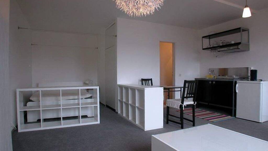 Ausgestattet mit einer modernen neuwertigen Küchenzeile mit Küchenkleingeräten. Der Wohnbereich ist mit einem Schreibtisch, Sessel, Sofa und Regalen eingerichtet. Internet inklusive. Die Schlafnische ist optisch mit Vorhängen vom Wohnbereich abgetrennt und mit einem französischen Bett und einem Einbauschrank ausgestattet. (Bettwäsche wird nicht gestellt). Das Appartement ist mit Teppichboden ausgelegt. Das hellgefliste Bad mit Waschbecken, WC und Duschkabine.