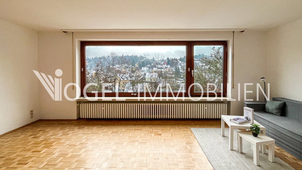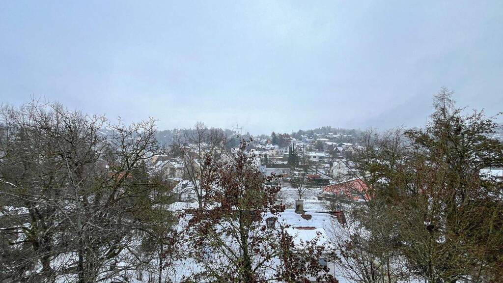 Im Obergeschoss öffnet sich ein heller Flur, dessen große Fensterfläche den Blick weit über das Tal lenkt und dem Raum eine besondere Offenheit verleiht. Von hier aus gelangen Sie auf den sonnigen Balkon mit beeindruckender Aussicht. Auf dieser Ebene befinden sich die separate Küche mit angrenzendem Abstellraum sowie der großzügige Wohn- und Essbereich. Die große Fensterfront prägt diesen Raum und bietet einen herrlichen Ausblick über den Ort und die umliegende Landschaft.