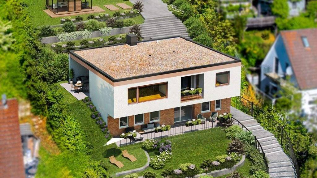 Der Zugang zum Haus erfolgt über einen gepflasterten Fußweg mit anschließender Außentreppe, die hinauf zum Gebäude führt und bereits hier einen freien Blick über die Umgebung eröffnet. Direkt an der Straße befindet sich eine großzügige Doppelgarage mit Platz für zwei Fahrzeuge. Ein seitliches Gartentor führt entlang des Grundstücks zu einem Treppenaufgang, der beide Hauseingänge miteinander verbindet.