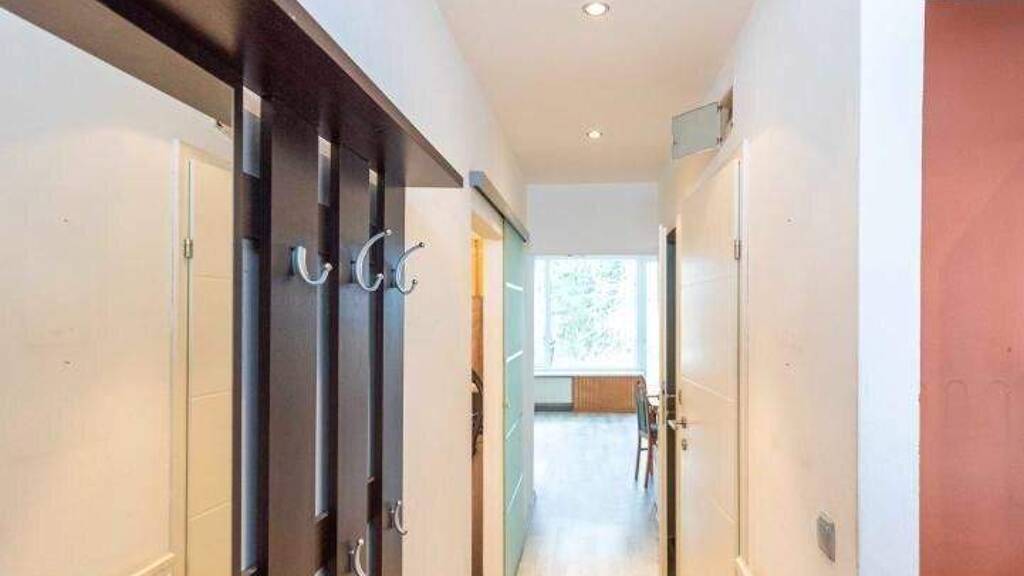 Vom Hauseingang 2 Etagen tiefer befindet sich die Wohnung, die sich schließlich ebenerdig zum weitläufigen Gemeinschaftsgarten öffnet. Das Herzstück der Immobilie ist das einladende Wohnzimmer, das einen direkten Blick in den Garten bietet und so eine besonders naturnahe Atmosphäre schafft.