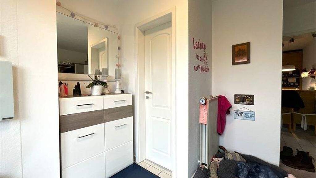 Über eine zur Straße blickdichte Zuwegung gelangt man zum Eingangsbereich des Hauses. Die Diele ist, wie das gesamte Erdgeschoss, gefliest, und bietet ausreichend Platz für Schuhregale, eine Garderobe und einen großzügigen Hundeschlafplatz, ohne dass es beim Anziehen eng wird.